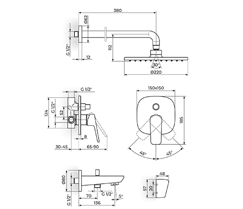 Naziv proizvoda: Bat. za kadu ugradna sa izlivom i rucnim tušem ROSAN - Stolz plafonski cetvrtast
