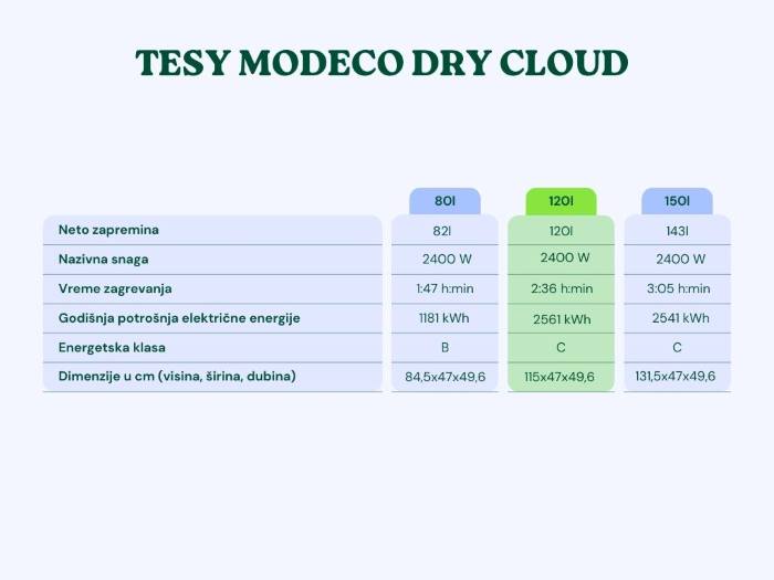 Uređaje ove lepeze odlikuje moderan dizajn, kao i najsavremeniji tehnološki noviteti koji u sebi usklađuju rešenja za uštedu energije i zadovoljavaju najstrože bezbednosne zahteve. Električni bojleri lagani su za upravljanje i nadzor sa svake tačke sveta preko mobilne aplikacije tesyCloud ili preko Internet brauzera. Lepeza raspolaže električnim bojlerima zapremine od 50 do 100 litara energetske klase В.