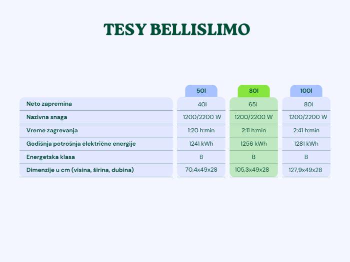 Neto zapremina 40 L Nazivna snaga 2200 W Energetska klasa B Vreme zagrevanja ?t 45K (15 - 60?)**80? 1:20 h:min Godišnja potrošnja el. energije AEC 1241 kWh Visina 0,709 m Širina 0,490 m Dubina 0,280 m Profil istakanja M V40 80 L T out of the box 79 °C MAX40 80 L