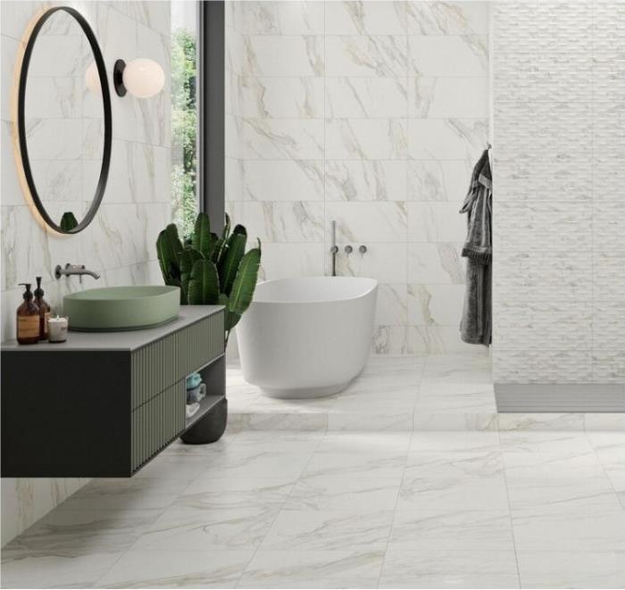 Pločice koje imitiraju prirodni beli mermer dizajnirane tako da vizuelno podsećaju na izgled belog mermera. Ove pločice pružaju elegantan i luksuzan izgled prostoru,  ali su lakše za održavanje jer ne zahtevaju posebne tretmane poput redovnog poliranja.
