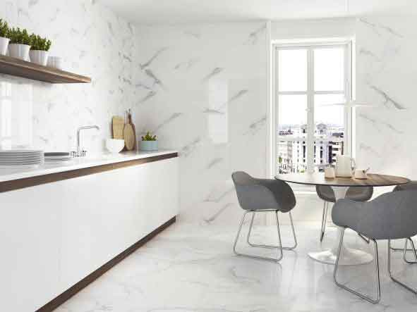 Pločice koje imitiraju prirodni mermer često dolaze u različitim nijansama belog mermera, uključujući svetlo sivkaste, bež, ili biserno bele nijanse. Obično nude realističan izgled i teksturu mermera, uključujući šare i žile karakteristične za prirodni mermer. Ove pločice su popularan izbor za enterijere zbog svoje elegantnosti i neutralnog izgleda.