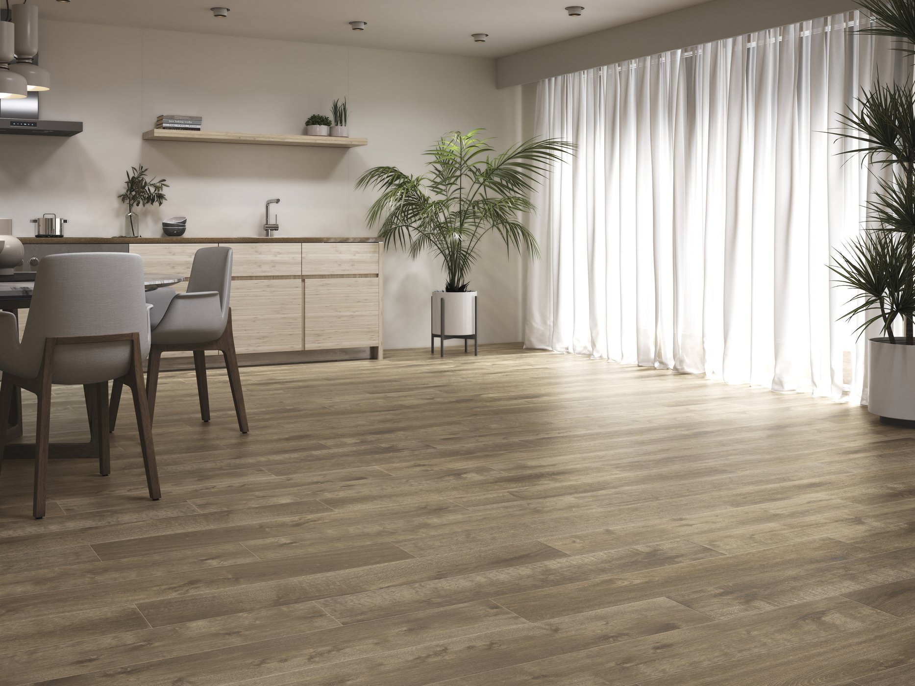 Pločice koje imitiraju drvo u nijansi NOGAL su popularne zbog svoje tople i prirodne boje, često se koriste za postizanje prirodnog izgleda drva u enterijerima poput dnevnih soba, trpezarija ili hodnika.