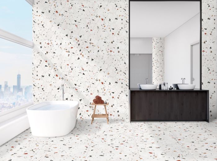 Teraco je materijal sastavljen od mrvica prirodnog kamena ili čipsa, veziva poput cementa ili smole, obično korišćenog kao podna obloga. Pločice SONAR inspirisane teracom u nijansi WHITE imaju belu ili vrlo svetlu boju sa zrncima ili mrljama koje simuliraju teksturu teraca.
